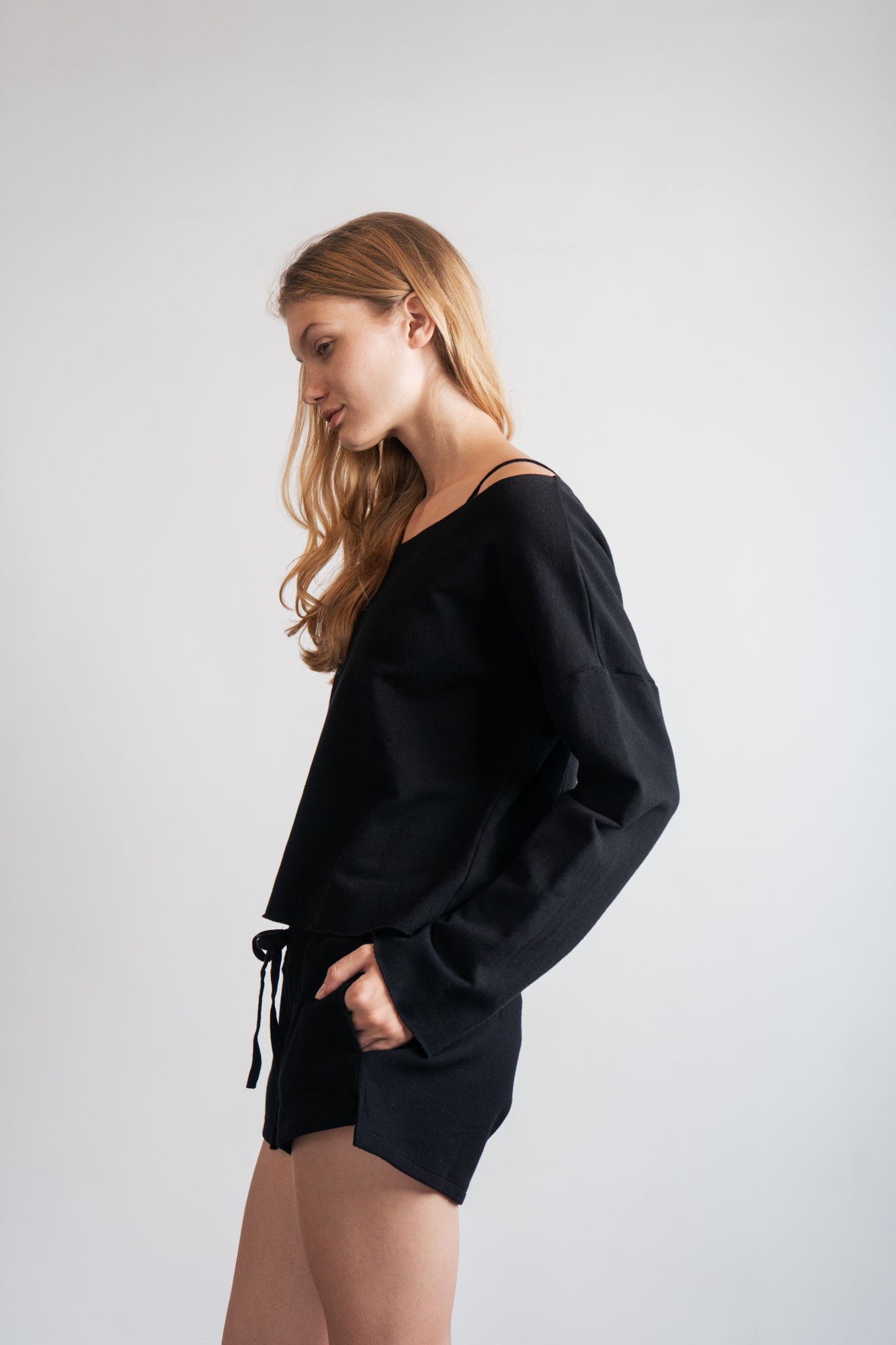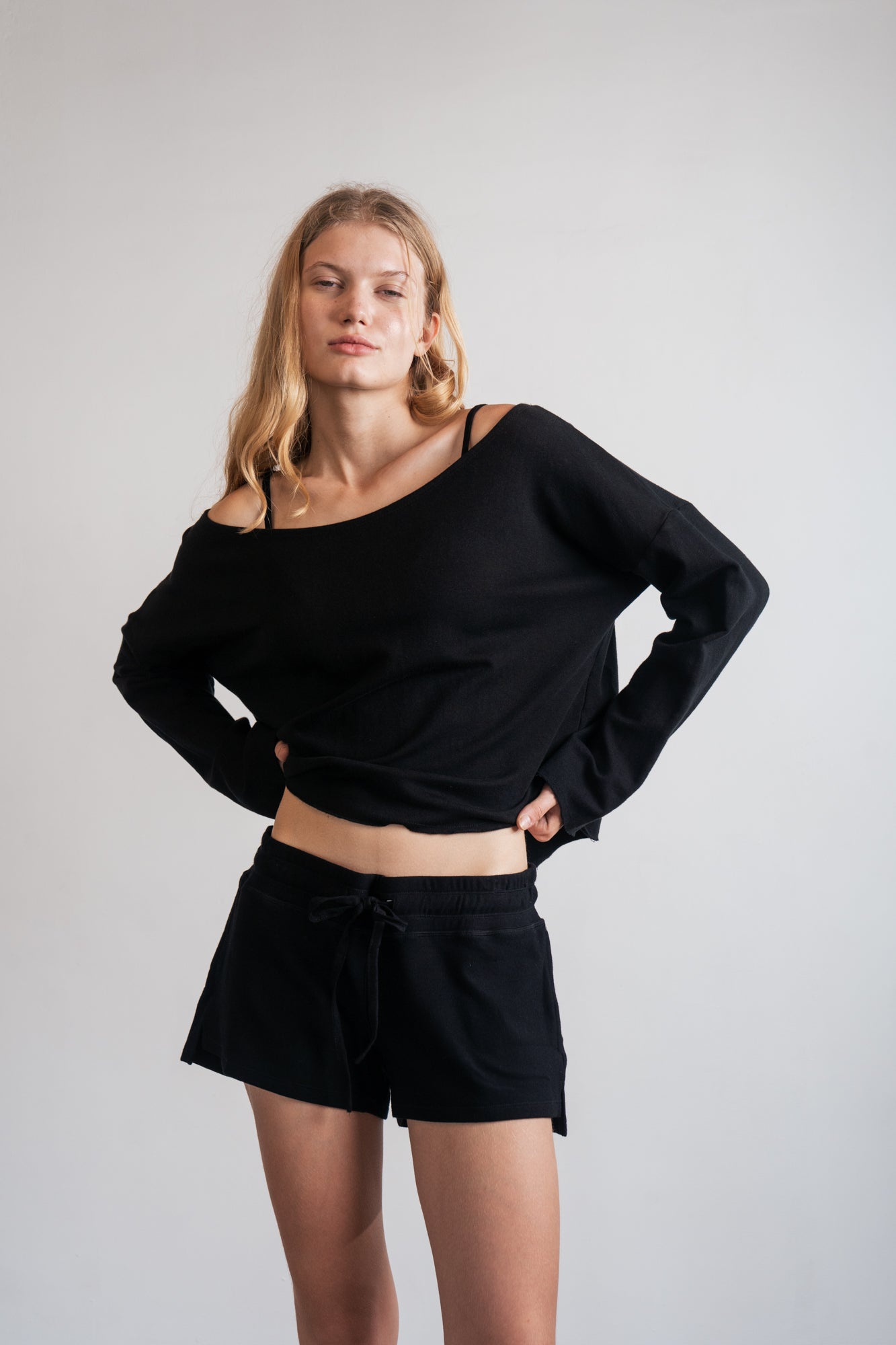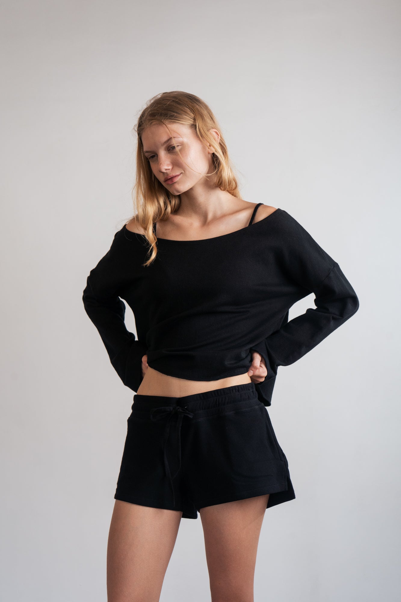 Cozy up in the SHOFI EDGE TOP black, crafted from sustainable bamboo fleece with OEKO-TEX® certifications, that feels as soft as a hug. Its short sweater design with an open neck and charming raw edges adds a playful touch to your casual look. Perfect for staying warm and super cute all day long!