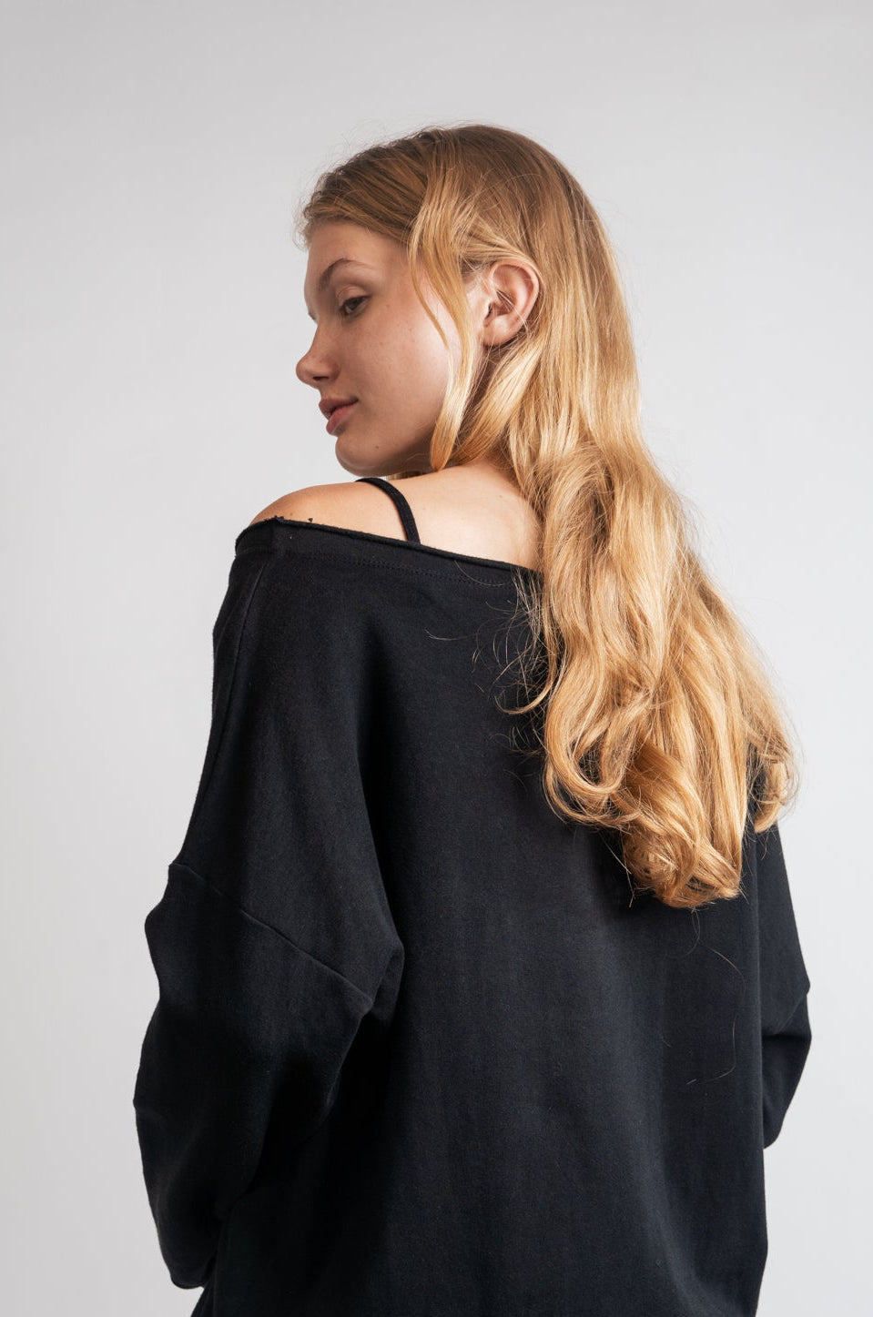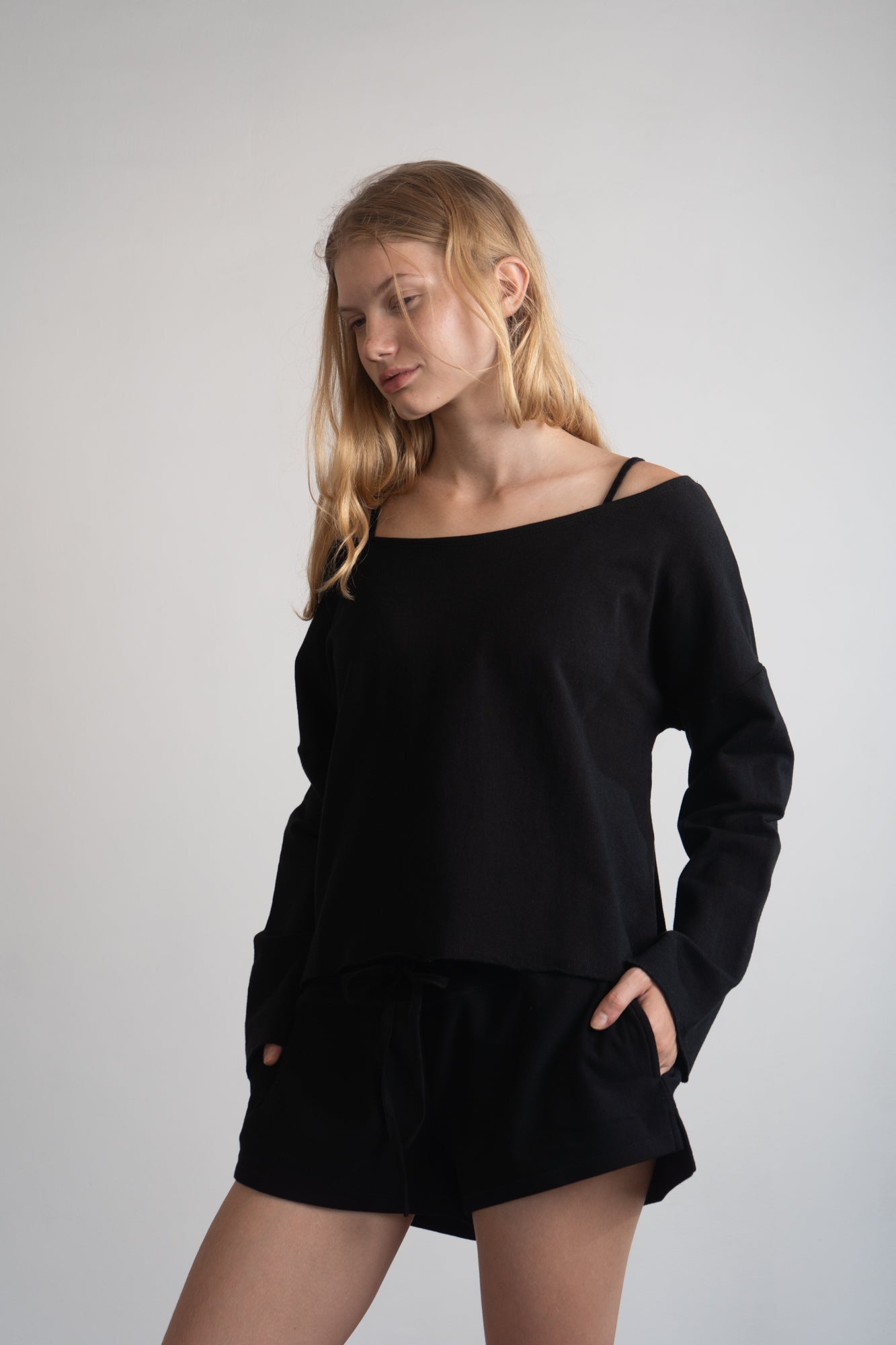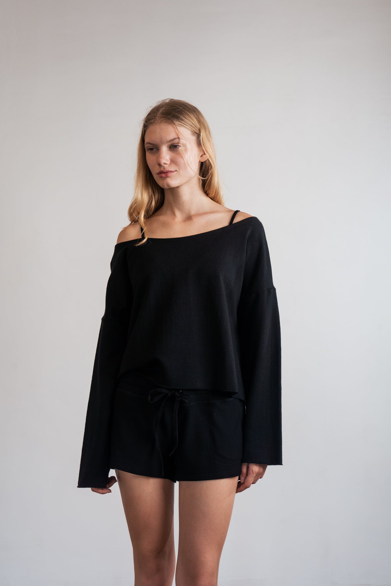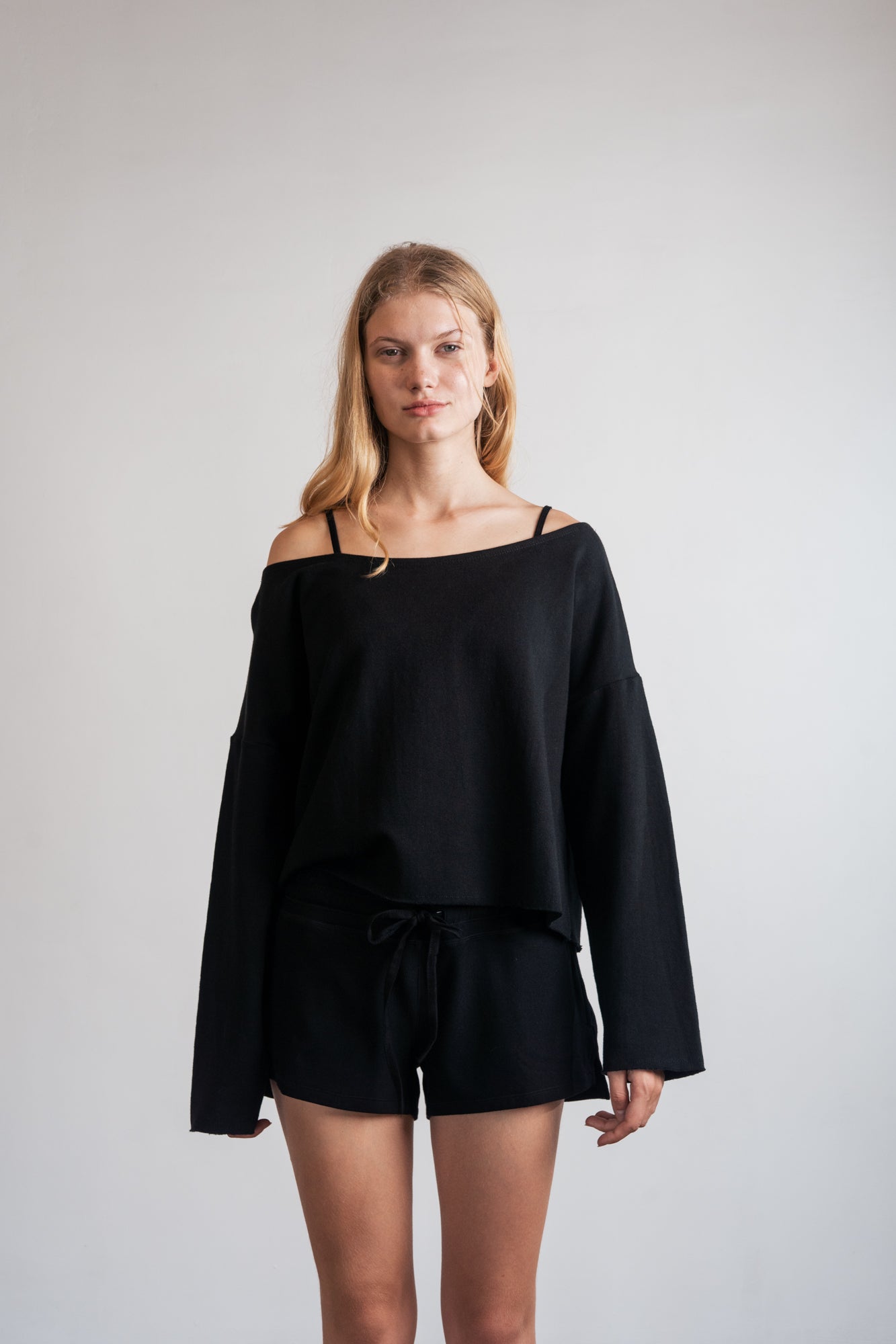Cozy up in the SHOFI EDGE TOP black, crafted from sustainable bamboo fleece with OEKO-TEX® certifications, that feels as soft as a hug. Its short sweater design with an open neck and charming raw edges adds a playful touch to your casual look. Perfect for staying warm and super cute all day long!