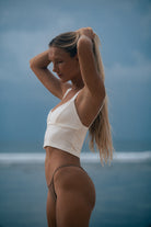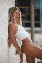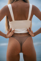 The timeless knickers now come in a delectable toffee color. The 1x1 eco rib material provides exceptional strength and a lavish, gentle feel. Whether paired with a classic triangle top or a body top (as shown in the pictures), please note that the top must be purchased separately. Our bikinis are crafted from regenerated nylon sourced from discarded fishnets and other nylon materials. Enjoy a robust and luxurious fabric that can withstand wear, crushing, and staining. Thank you for selecting a sustainable option.