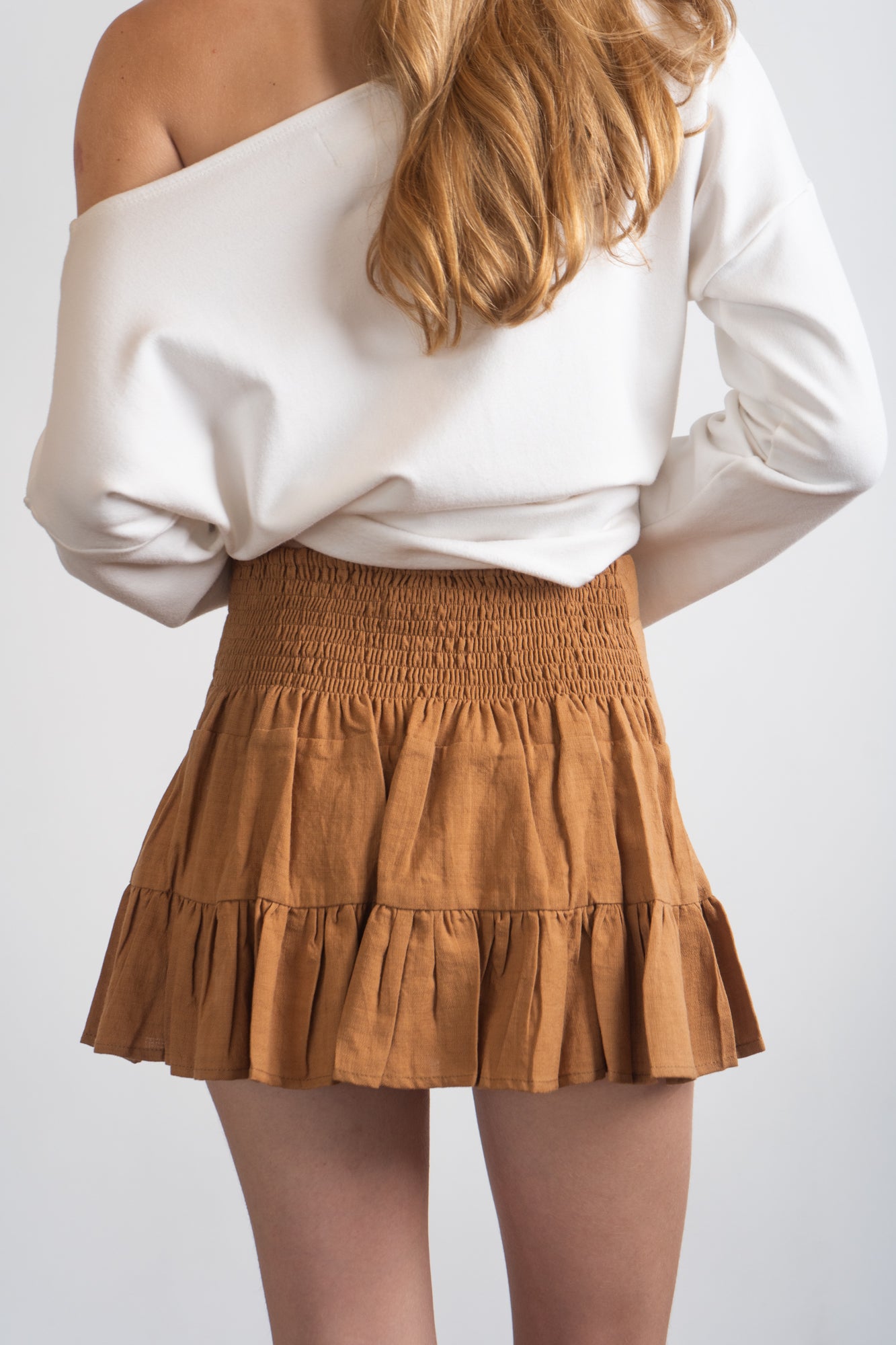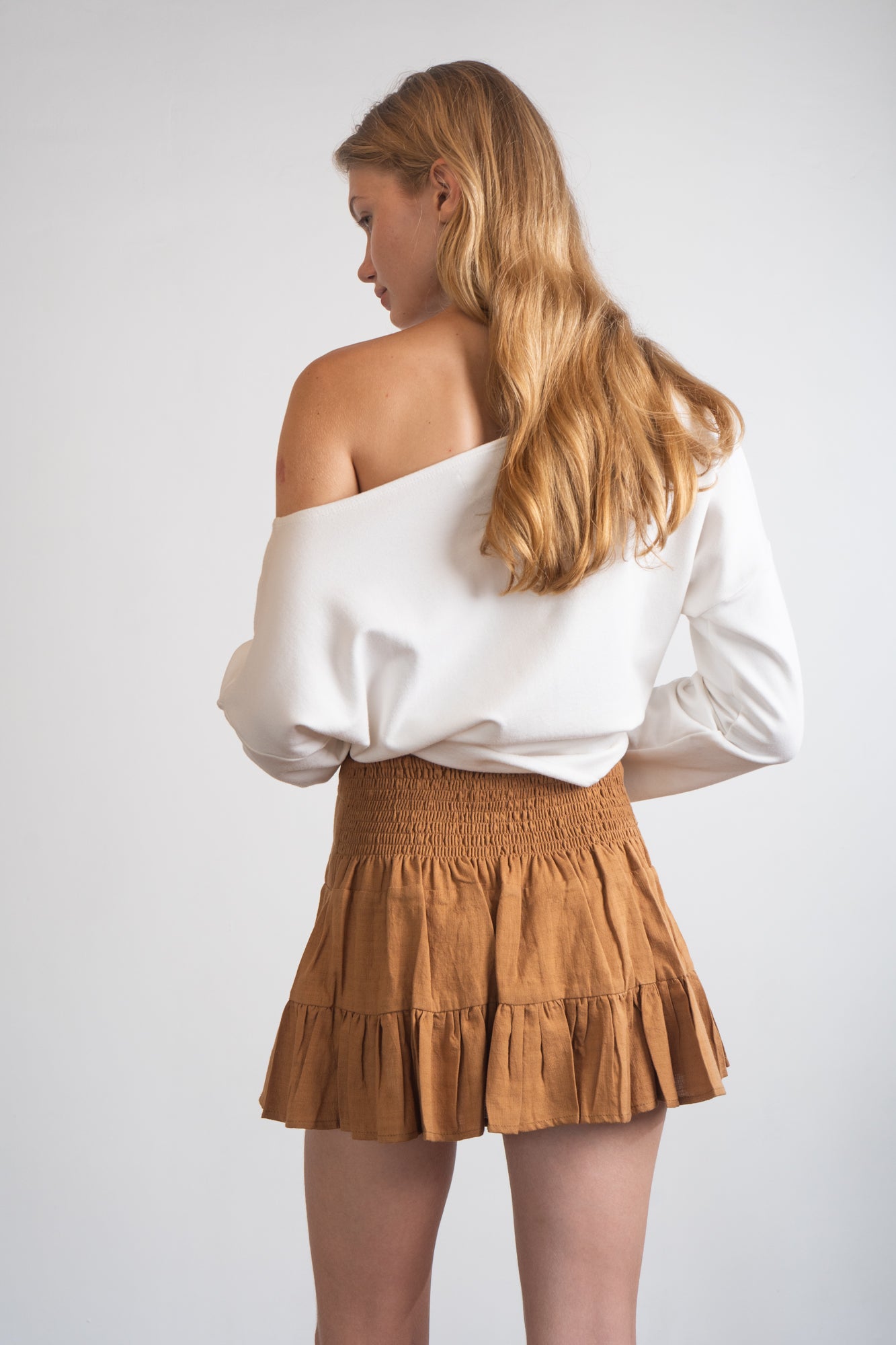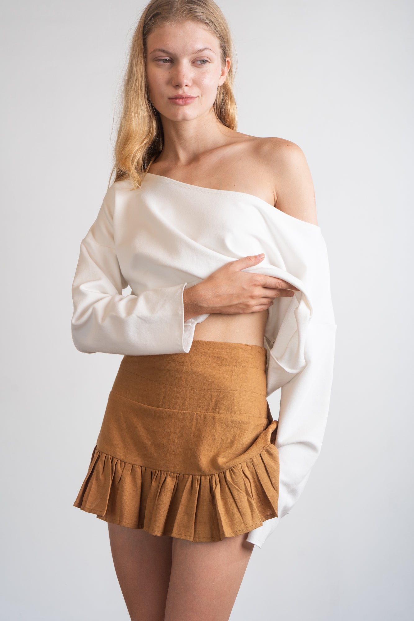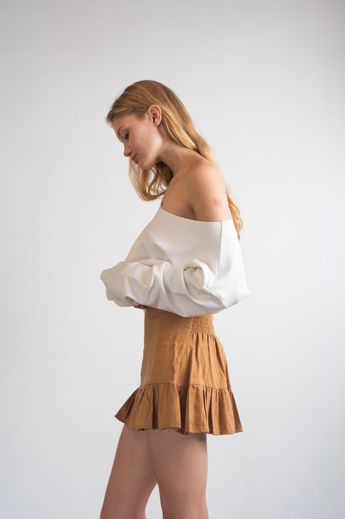 Woman in a white shirt standing against a textured wall with sunlight casting shadows.