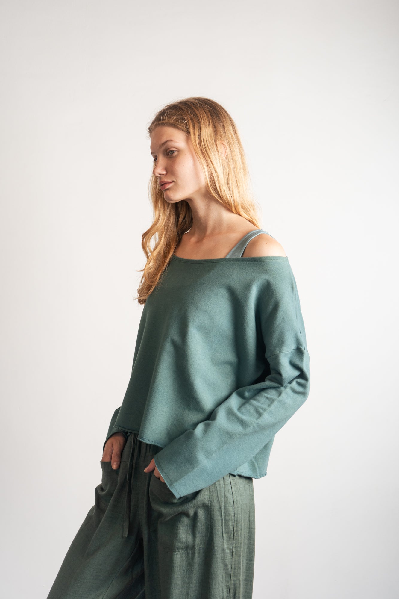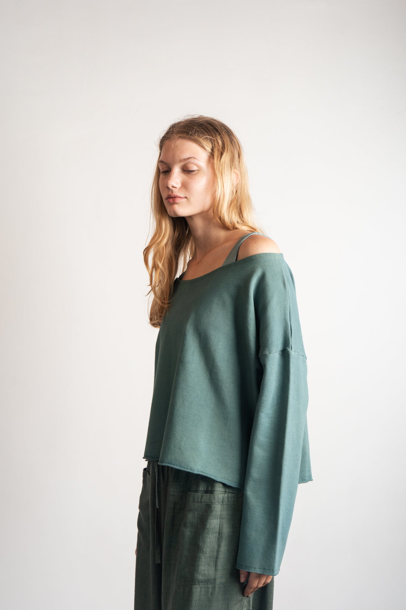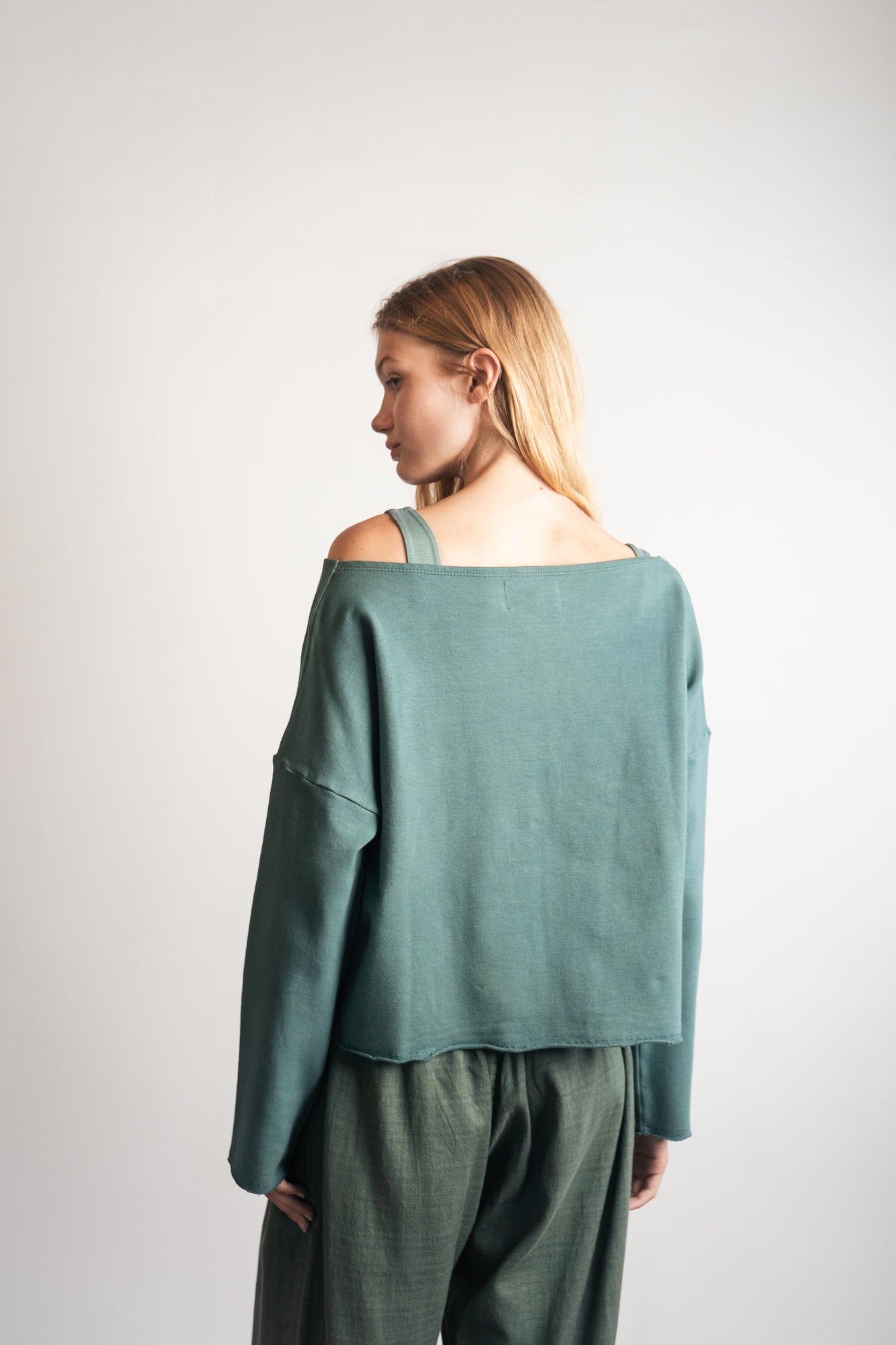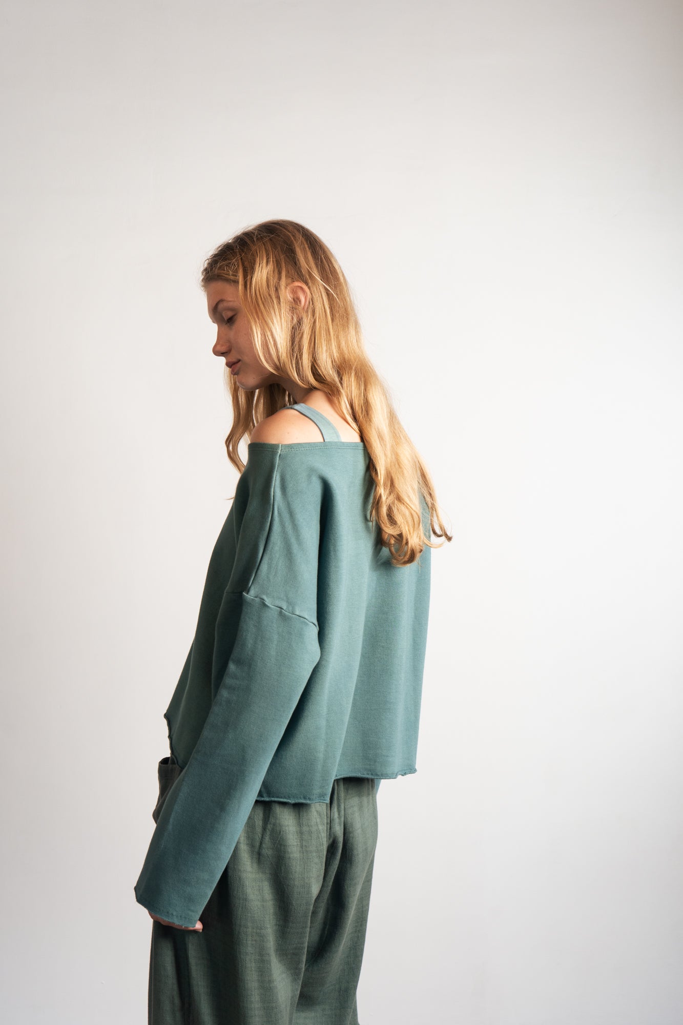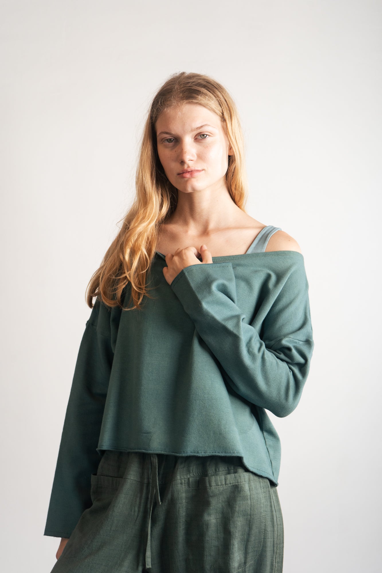 Mímate a ti misma con el SHOFI EDGE TOP Army, confeccionado con felpa de bambú sostenible, suave como un abrazo. Su diseño de jersey corto con cuello abierto y encantadores bordes sin rematar le da un toque divertido a tu look casual. ¡Perfecto para abrigarte y ser súper mono todo el día!